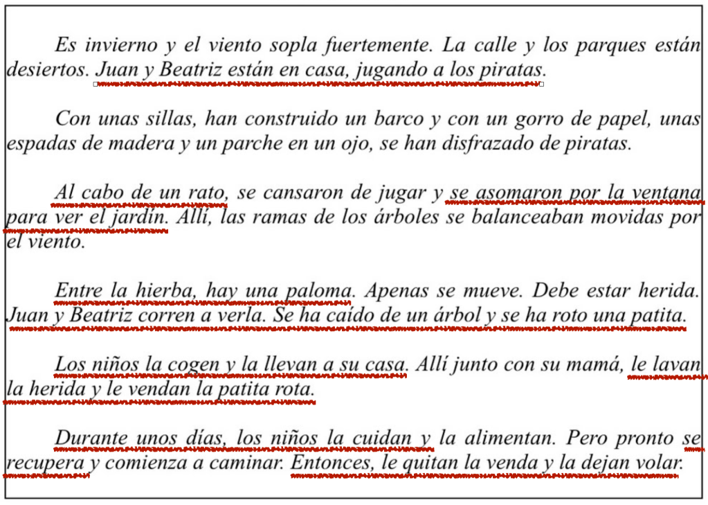 Tenemos la siguiente narración titulada «La paloma». La subrayamos. Esta es la propuesta de subrayado que elegimos.