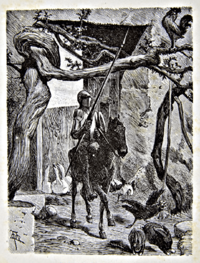 Todas las prevenciones hechas por su ingenio e industria le esperaban ahora, fieles al momento. Nombres peregrinos ya duplicaban y magnificaban el mundo, su mundo. Aunó sobre su recia complexión espigada el peto y el espaldar. Se ciñó la escarcela protegiendo sus secos muslos. Sobre la gola, asentó su diputada celada de finísimo encaje —el morrión contrahecho con su frágil visera de cartón— que evitaría las contingencias de la lucha o el mal tiempo amenazando su noble cabeza. Envainó su hoja de Toledo, embrazó la adarga, tomó la vieja lanza. El alma parecía regresar y convocar a aquellas cosas heredadas por su sangre pretérita. Se aprestó a la cabalgadura imperfecta y sobre ella montado, salió por la puerta falsa del corral a campo abierto, encomendándose a la azarosa voluntad del animal, tal como los libros que desatinado le tenían, juraban que así debía ser conforme a su nuevo oficio. Hemos de suponer que aquel, preñado de vértigo y soledad absolutos, fue el instante supremo de su célibe vida, .