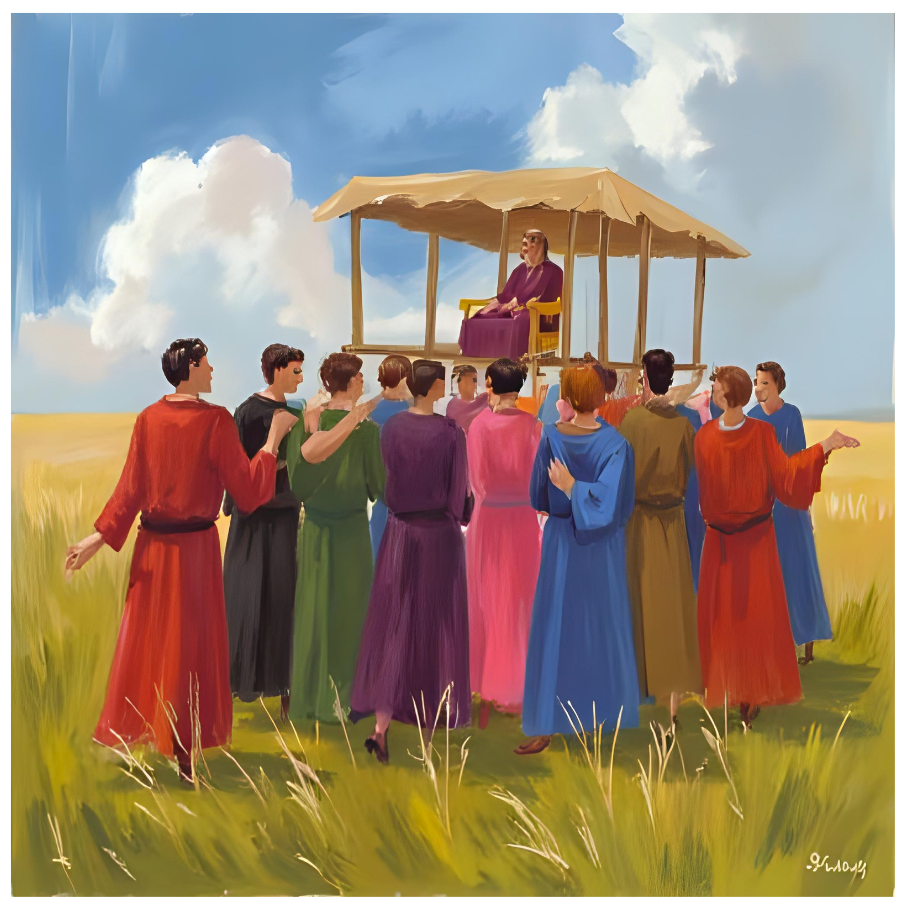 Entre empellones, se agolpan al paso de la plataforma de madera; lloran, se mesan el cabello, extienden los brazos al cielo como urgiendo el maná, galvanizados por un fogonazo de arrebatado júbilo. Avanzan hacia la loma atravesando la húmeda pradera, veteada de flores, salpicada de árboles y arbustos. «Nuestro sabio líder camina… ¡Camina!… pese a su sufrimiento incomprendido, pese al odio que le tributan los mediocres, los adocenados, los injustos y los necios. Hemos conjurado gracias a él la vil disipación y por ello, a él le debemos también nuestra salvación. Es como un mesías para nosotros, espíritus libres… para nosotros que fuimos históricamente acusados de injuriar el orden y la moral establecidos ¡Al fin, nuestro espíritu libre hecho carne!» clama uno traspasado por una especie de epifanía.